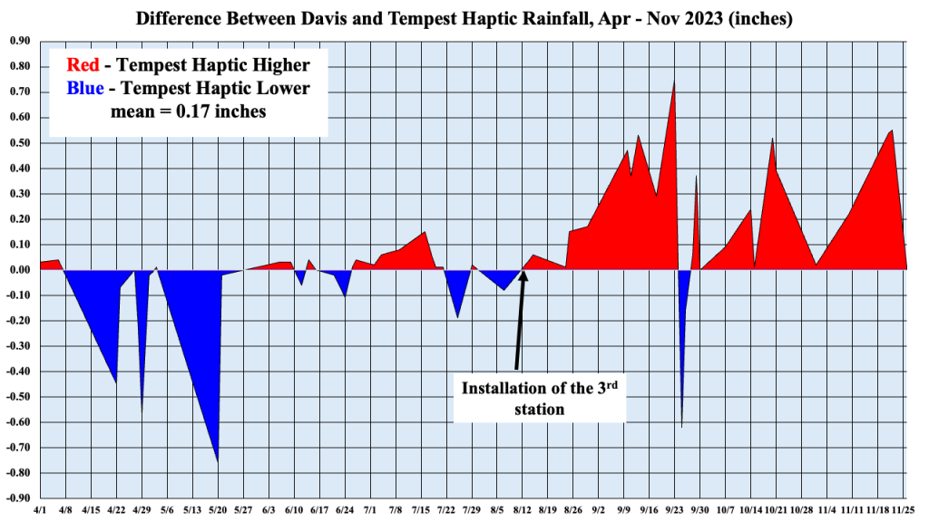 Differences between the Vantage Pro 2 rainfall and the Tempest Corrected rainfall followed the same basic pattern as the Tempest Haptic rainfall, though the differences were slightly larger. This is most evident during June and July 2023, as the peaks and valleys in the rainfall differences were seen. Peaks and valleys in the rainfall differences remained after the 3rd station was installed and continued through November. Though the overall mean value of the differences in rainfall amounts between the Vantage Pro 2 and the Tempest rainfall amounts were small, the Tempest Corrected rainfall amounts were slightly better, despite the peaks and valleys.