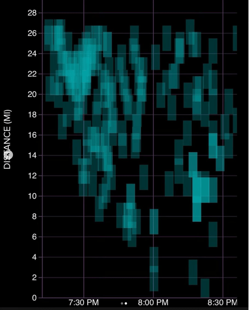 This image shows a depiction of the lightning detector output within the Tempest app. Output from the sensor almost always compared favorably with the lightning detection sensor output from the GOES-16 satellite.