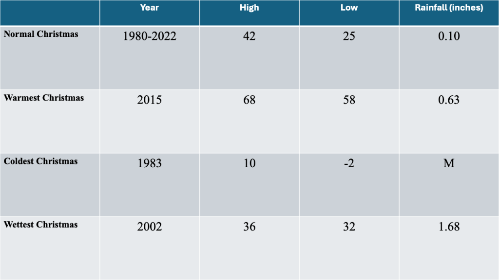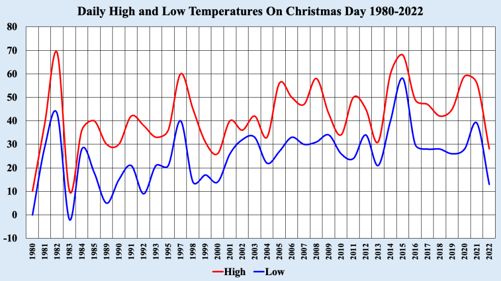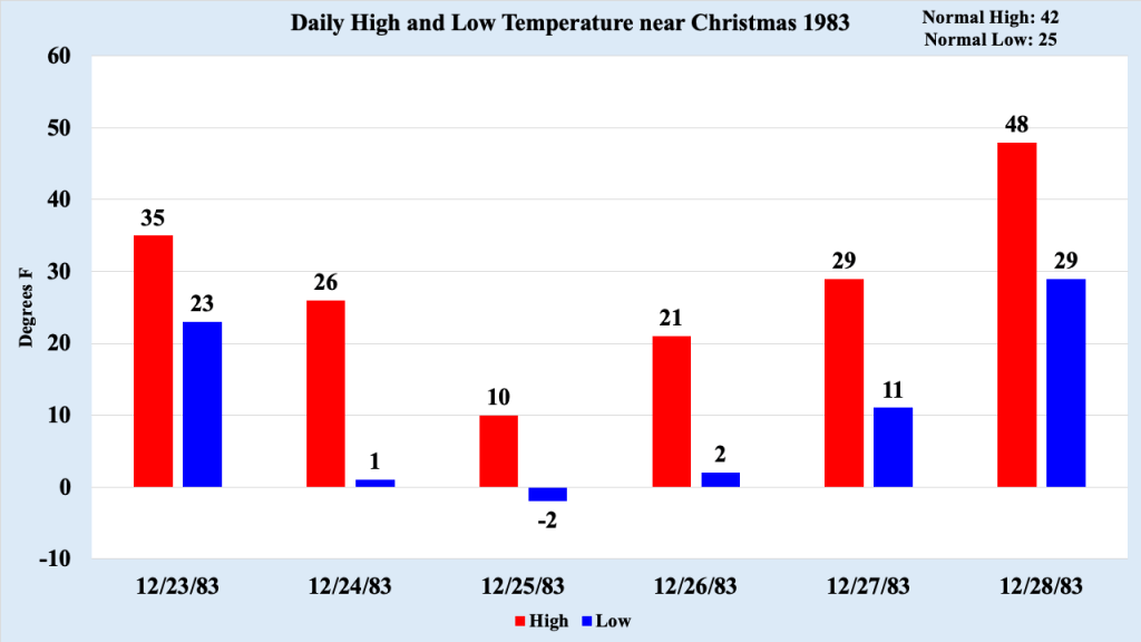 The two coldest Christmas Days in our database occurred in the early 1980s, near the very beginning of our recording keeping days. Christmas Day 1983 was the coldest, with a high temperature of 10 degrees F and a low of -2 degrees F (marking the only time a temperature below zero was recorded on Christmas Day in our database). An arctic front passed through the region during Christmas Eve. A few snow showers accompanied the front, but not enough to cover the ground. Gusty northwest winds blew away any snow that did accumulate, as temperatures slowly dropped in the afternoon into the evening, setting the stage for the coldest Christmas day. Though Christmas Day itself was sunny, the high of 10 degrees F is tied for the second coldest high temperature in our dataset.