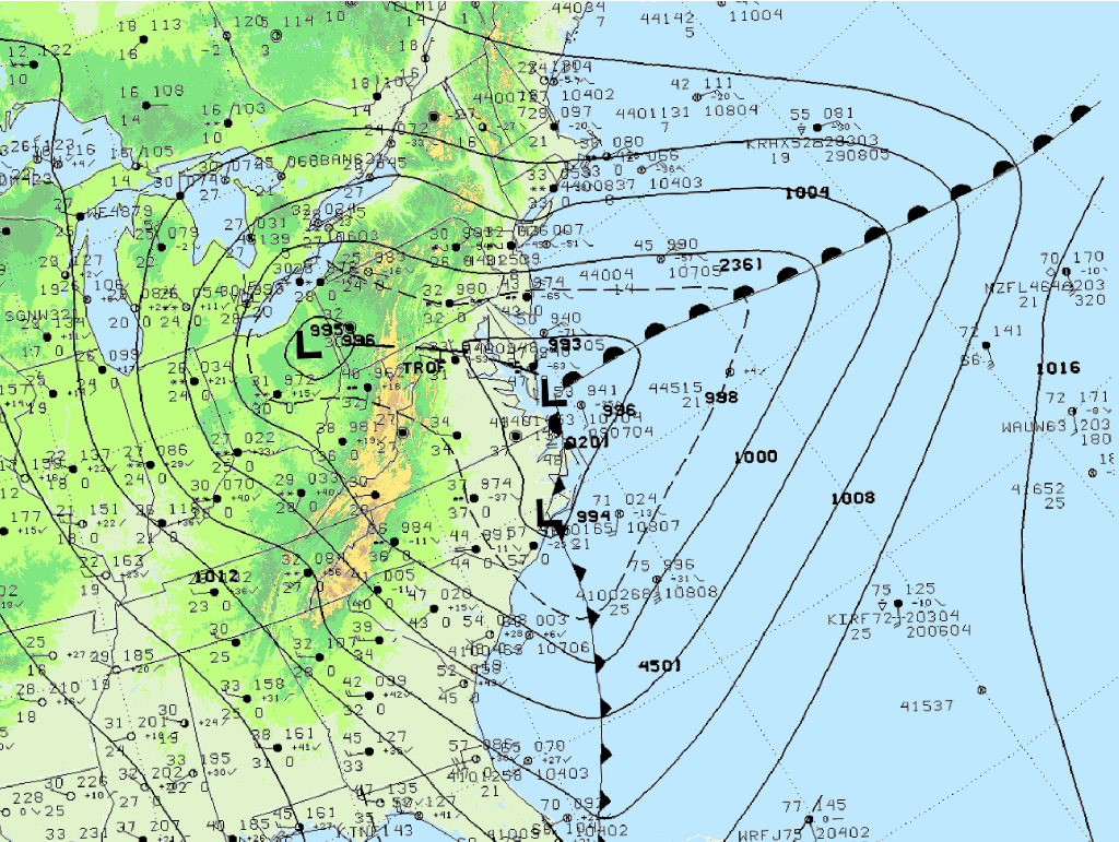 There was a close call regarding a white Christmas in Toms River in 2002. Figure 4 shows low pressure weakening over eastern OH before a secondary low formed over southern NJ during the early afternoon. Heavy rain developed in the relatively mild easterly flow ahead of the low, but as it deepened on its way to New England, colder air on the back side of the system changed the rain to snow in Toms River. My brother measured about an inch and one-half of snow late in the day, but it could have been higher due to melting and compression. Had the snow occurred 12 hours earlier, Christmas Day 2002 would have qualified as white Christmas.