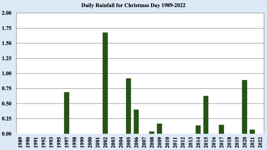 Between 1989 and 2022, rainfall was observed 11 times during the 32 year span, averaging measurable rainfall every three Christmas Days. This matches the overall rainfall pattern for this location, with rainfall measured about every third day throughout the year. By far the largest amount of rainfall recorded on Christmas day occurred in 2002, when a deepening low pressure system over southern NJ resulted in heavy rain changing to heavy snow before ending during the evening hours.