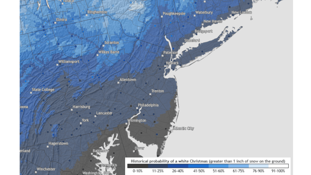 While the NOAA/NWS probability map was derived from information spanning 1990-2010, it seems to provide a fair estimate for a white Christmas. When I lived in southern ME (just northeast of Portland), we had a white Christmas 7 of the 13 Christmas Days I was there, which is close to what the NOAA/NWS probabilities indicate. Of course, timing is also important. On Christmas Day 2002, we had no snow on the ground at 7 am, but by that evening, more than a foot of snow had accumulated. So while we did not technically have a white Christmas, it was certainly white shortly afterward.