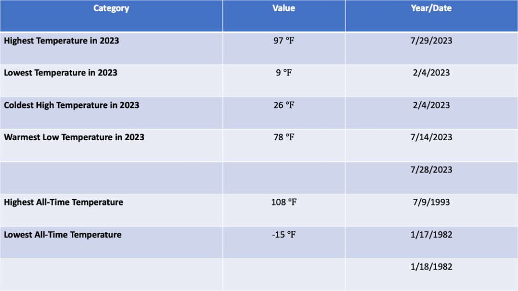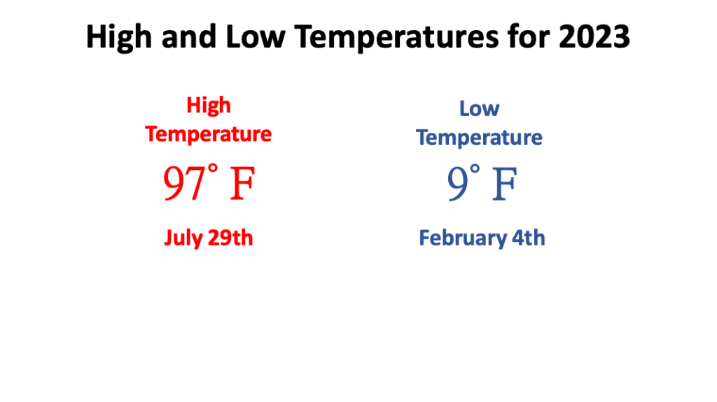 By contrast, late spring and early summer (May and June 2023) was cooler than normal. During this time, no record high or low temperatures were set, as the period was generally cool. July 2023 experienced warmer than normal temperatures, and the highest daily temperature of the year occurred on the 29th of the month. However, August 2023 was about normal with respect to temperature, meaning that the meteorological summer (June/July/August 2023) was essentially normal temperature wise, bucking a trend of warmer than normal summers over the past few years.