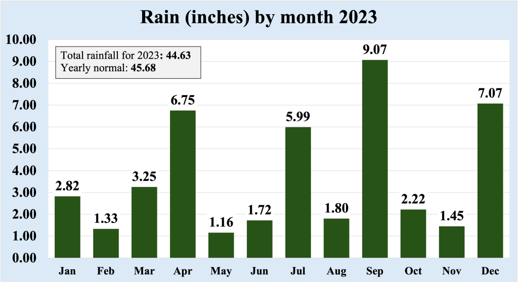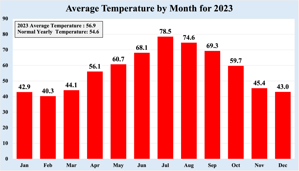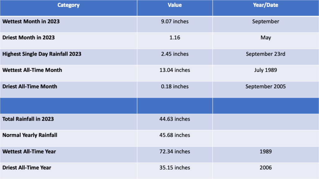 November 2023 was slightly below normal with respect to temperature, but December 2023 was much normal than warmer, ending the year as it began; with impressive warmth. In total, 13 daily record high temperatures were established during 2023, though they tended to occur in bunches (four in February, three in April, and four in October). This phenomenon makes sense from a meteorological perspective, as very warm and/or very cold periods tend to be stable, allowing these conditions to persist for a few days at a time. Amazingly, NO daily record low temperatures were set for the year, underlining the overall warmth of 2023.