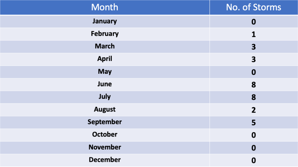 Table 5 Number of thunderstorms detected in Toms River, NJ by month during 2023.