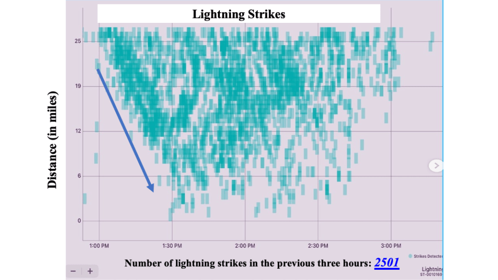 With the acquisition of a weather station capable of detecting the occurrence of lightning at the end of 2022, we are capable of detecting lightning strikes with about 25 miles of the station. So far, the accuracy of the lightning detection system appears to be excellent, at least when compared to the lightning sensor aboard the GOES-16 satellite (you can check out the GOES Lightning Mapper output here).