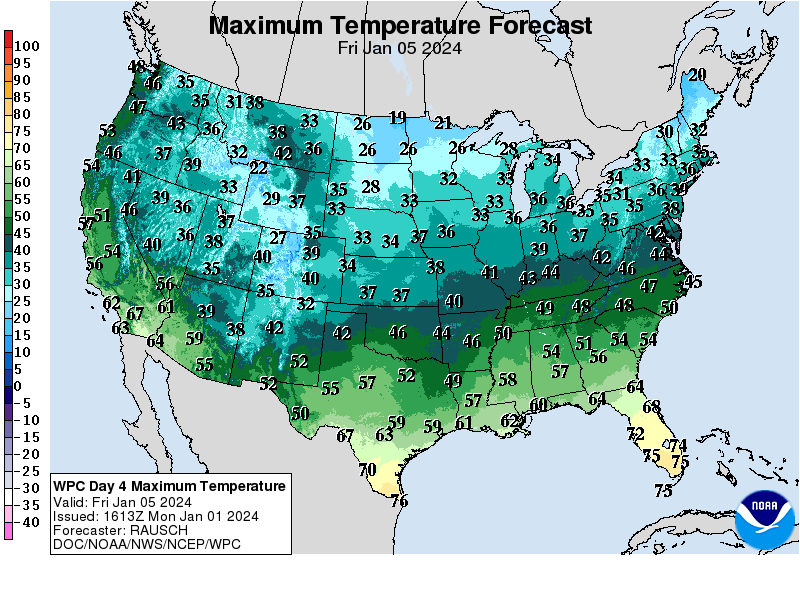 Figure 6 WPC forecast of precipitation for the late weekend event. Where rain is the dominant precipitation type, between 1 and 2 inches of rain is possible.