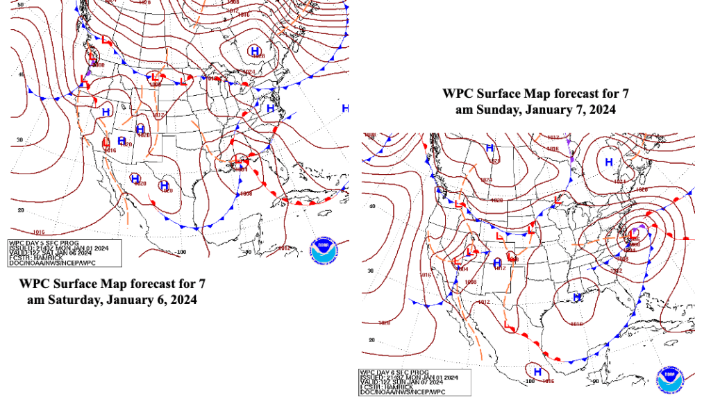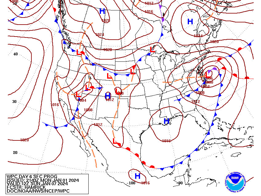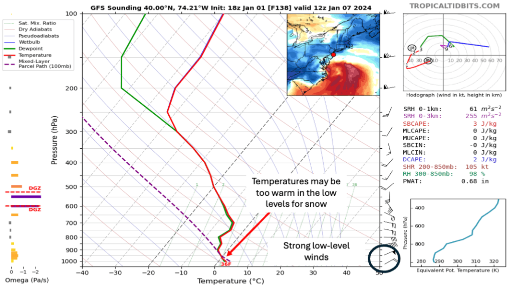 Though the system is nearly a week away, the pattern suggests that warmer temperatures along the coast would result in a mostly rain event for the Jersey Shore, especially from coastal Ocean county south. So, at this distance, the odds of Toms River seeing its first accumulating snow are quite low. Figure 5 shows a model sounding near Toms River at 7 am Sunday, January 7th. A sounding is a meteorological tool that shows temperatures, moisture and wind at different levels in the atmosphere. In this image, the Global Forecast System (GFS) model shows the freezing level about 1,000 feet above the surface. Any snow falling into this layer would change to rain, and the black circle on the bottom right hand portion of the sounding indicate strong east northeast winds, which would suggest that temperatures would remain above freezing through the strongest part of the storm.