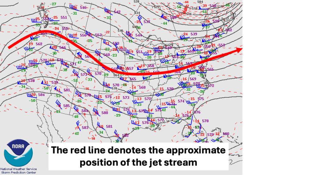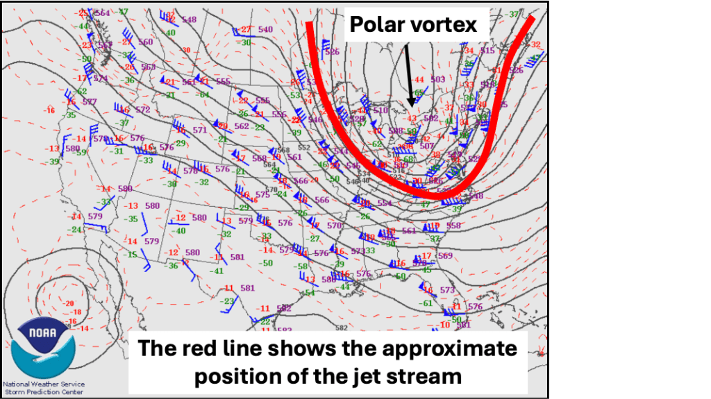 However, a buckling jet stream across central and eastern Canada would deliver the coldest air in years to portions of the Northeast. Figure 3 shows the approximate position of the jet stream. Note that the flow comes down from northern Canada. This flow configuration is often referred to as “cross polar flow” because, as the name implies, the air is drawn from the North Pole directly southward. Air flowing directly over the North Pole has little time to modify, and is often the source of the coldest air in NJ.