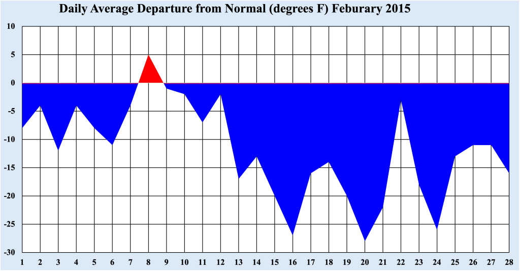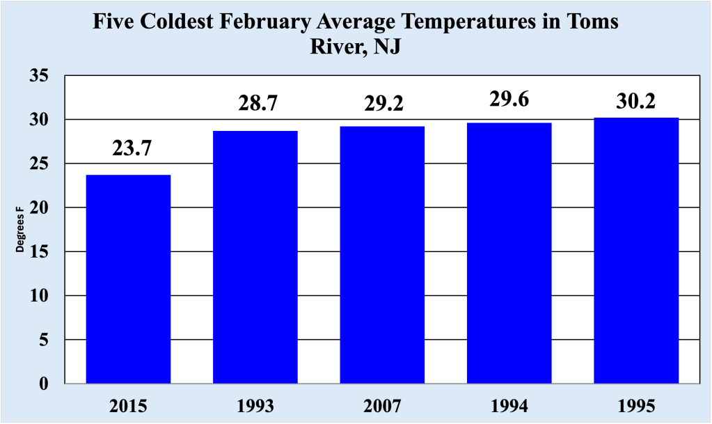 February 2015 was the coldest February on record for the Bellcrest section of Toms River NJ (where temperatures records date back to 1978). In fact, it was a full five degrees colder than the second coldest February (1993), which is impressive considering this is the coldest time of the year. February 2015 is also the second coldest calendar month for the location, just a few tenths of a degree warmer than December 1989.