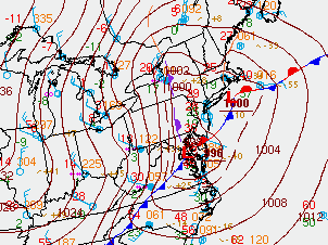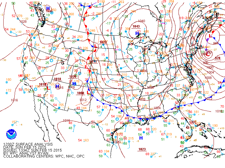 Figure 1 Weather Prediction Center’s (WPC) surface analysis on February 15th, 2015 at 7 pm. Note the strong high pressure system over southern Ontario. This system would deliver the coldest air of the coldest February on record to the Bellcrest section of Toms River, NJ.
