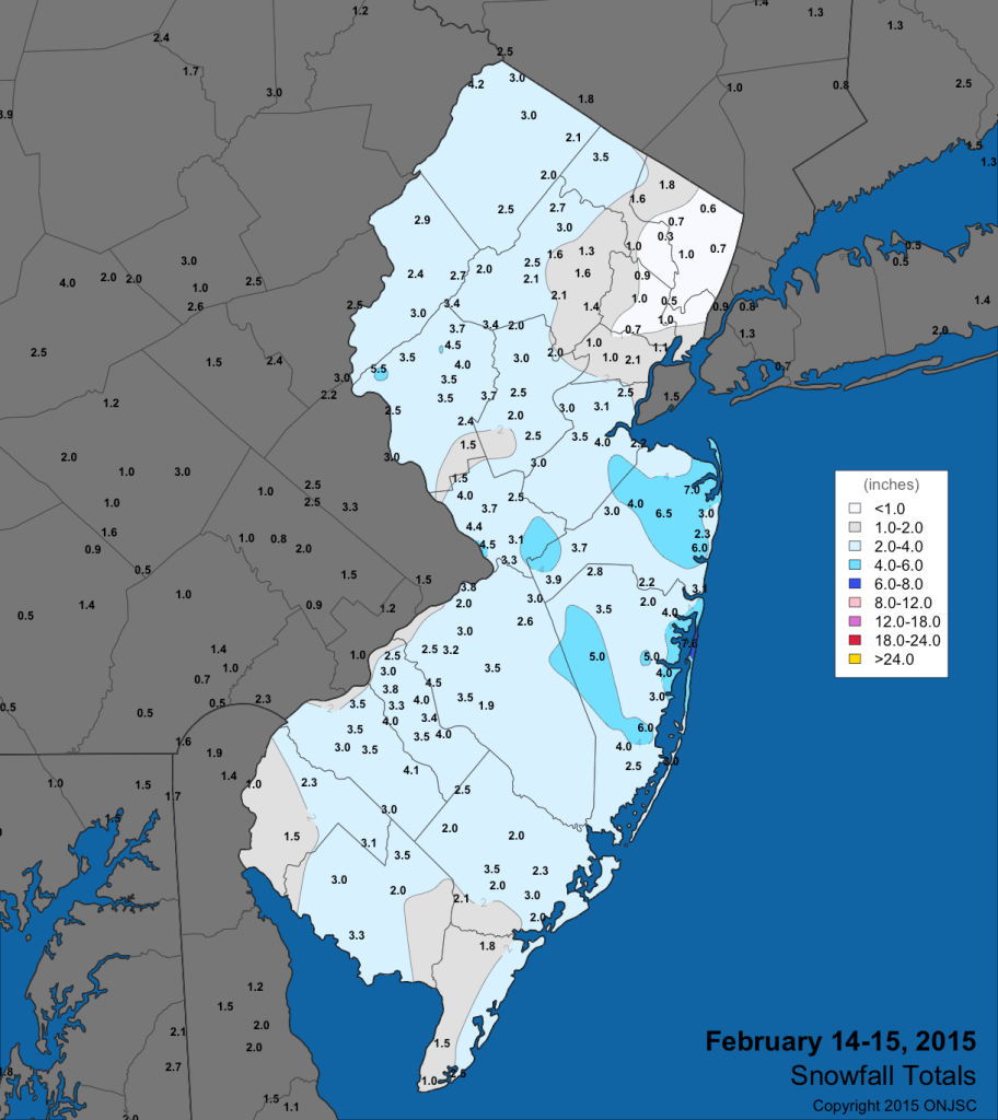As the Arctic cold front crossed the Mid Atlantic and Northeast states during the overnight hours of February 14th/15th 2015, a surface low pressure system developed on the front, in response to the polar vortex. While the moisture content of the air was limited, the upward motion near the front and surface low made the most of it, producing accumulating snow across much of the state, with amounts exceeding 5 inches across central NJ. That surface low deepened as it moved off the coast and produce heavy snow in portions of New England during the 15th of February.