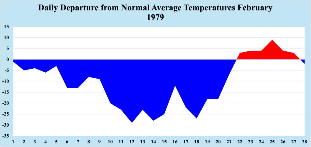 Following a fairly normal early portion of February, the weather pattern turned considerably colder across NJ for the middle of the month. Changes in the orientation of the jet stream allowed Arctic air to slip southward into the Northeast US, dropping temperatures well below normal. During the coldest portion of the Arctic intrusion, (generally between the 12th and the 20th of February), temperatures averaged 20 to 30 degrees below normal! Below zero low temperatures occurred five consecutive days during this streak, with a low of -8 recorded on the 12th. It should be noted that our data archive did NOT include this temperature information. Instead, temperature data from a nearby station in Toms River NJ was used (about four and one-half miles west of our station). While I remember February 1979 as being cold, I was unaware of the extent and magnitude of the cold during the month.