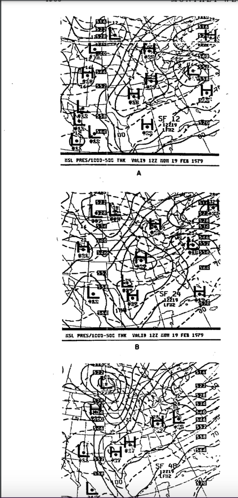 Snow developed during the overnight hours into Monday morning, February 19th, 1979, in response to the surface low. Though the LFM forecast of the position of the surface low was fairly accurate, the developing storm was MUCH deeper than forecast. While the reasons why the storm strengthened so quickly lies beyond the scope of this blog entry, in practical terms the changes that were occurring as the storm was deepening were too complex to model effectively (meaning the model’s ability to track such changes were limited). This same LFM model did an amazing job forecasting both the track AND strength of the Feb 6th/7th 1978 blizzard, but the factors that were important to the development that storm were within the model’s capabilities.