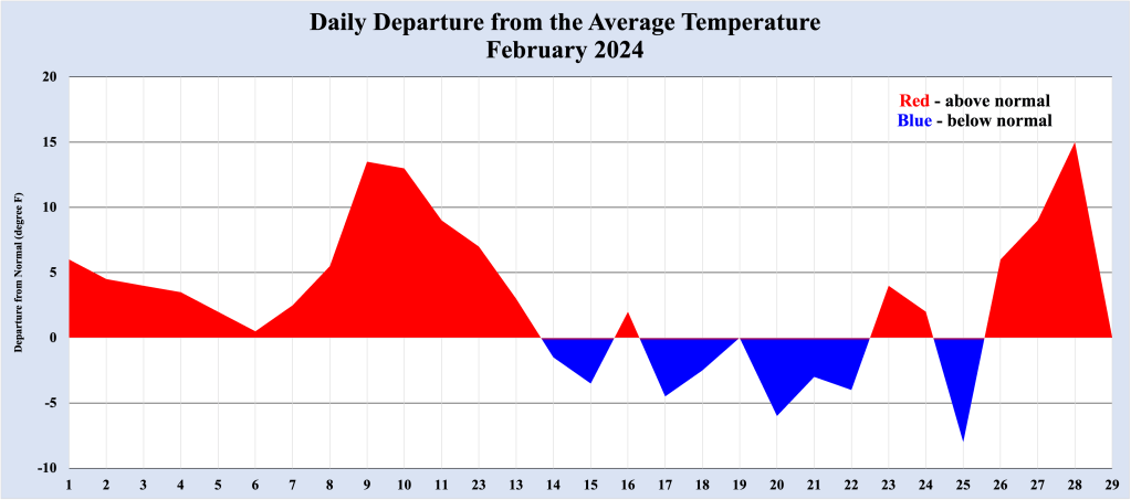 Figure 1 shows the daily average temperature departure from normal for February 2024. Both ends of the month were very warm, with the coldest part spanning the middle. The warmer periods (shown in the red) were much more pronounced than the cooler periods (in blue), though the cooler temperatures dominated the middle portion of the month. Even with the swings in temperature during the month, no daily record high temperatures or daily record low temperatures were set.