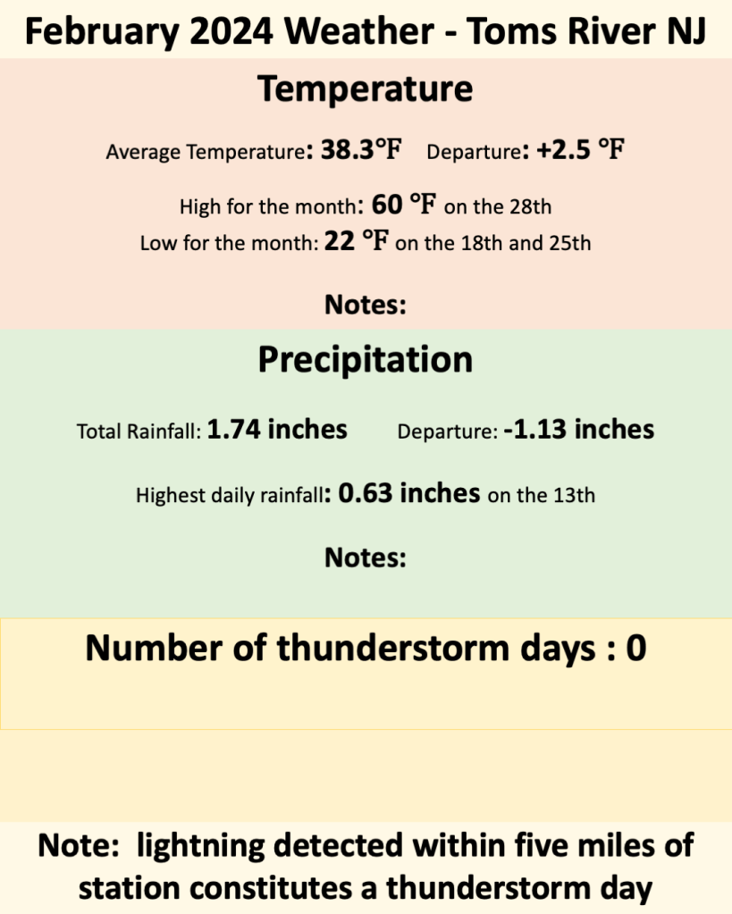 Through the middle of February 2024, only two precipitation events were recorded, and both events produced light to moderate rainfall events. At that time, it appeared as though this February could become one of the five driest Februarys at this location. (rainfall records date back to 1989). Subsequent light precipitation events (which included a measurable snowfall event along the Jersey Shore) pushed the monthly total above 1.50 inches. That number falls into the middle of the pack when it comes to February (when the average monthly rainfall is 2.87 inches). So while the month as a whole was drier than normal, it was nowhere near the driest February ever (which occurred in 2009, with a mere 0.31 inches of rain recorded that month).
