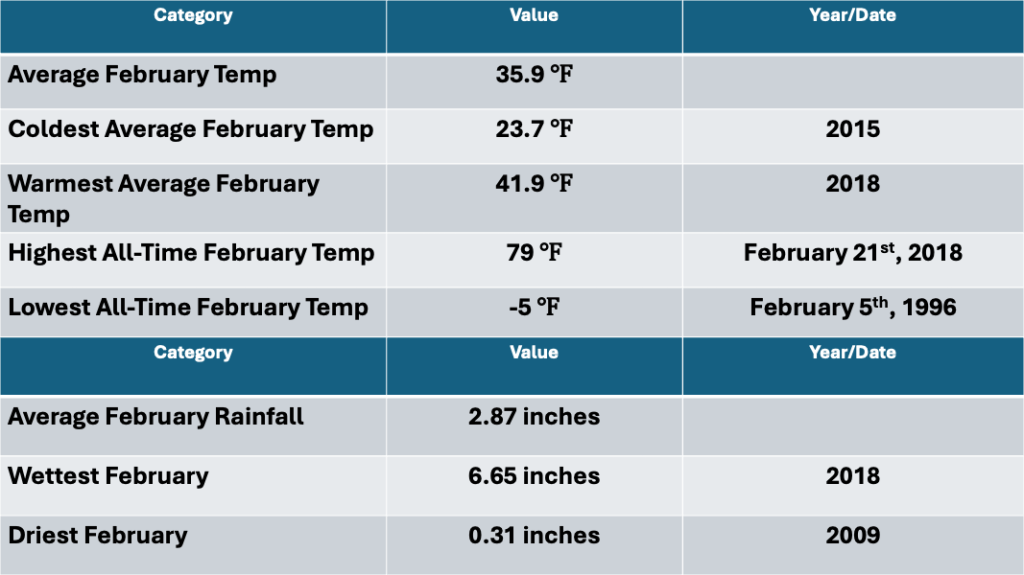 Our Tempest Weather Station has an onboard lightning detector, which allows us to log lightning activity within 25 miles of the sensor. For our purposes, a thunderstorm day happens when lightning is detected within five miles of the station. Despite the warmer, roller coast like temperatures this February, our station did not log any thunderstorm days. In fact, our sensor has not detected a storm within five miles of the station since September 23rd, 2023.