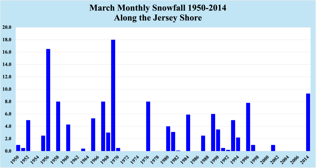 Though most people along the Jersey Shore do not necessarily associate the month of March with snow (particularly when temperatures approximate spring like conditions), snow can and does fall during March. More Marches see accumulating snow than not, but most snowfalls are not heavy in nature. The highest snowfall totals are typically associated with winter like storms, and their occurrence is rare during March.