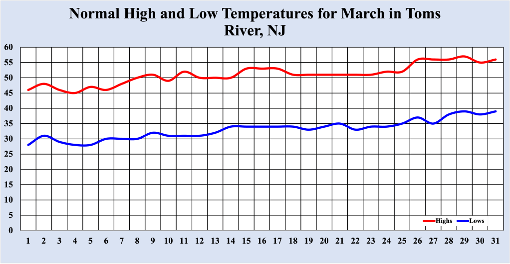 Despite the warmer temperatures over the last couple of days, and the forecast of above normal temperatures into the middle of March 2024, it can still snow along the Jersey Shore during March. Of course, the time of year becomes more detrimental to snowfall during the month. Normal high temperatures during March range from mid 40s in the early portion of the month to the mid 50s by the close. Accumulating snow generally needs air temperatures close to the freezing mark, so for snow to accumulate, temperatures would need to be 15 to 25 degrees colder than normal. Given the increasing sun angle, this is a tall order along the Jersey Shore.