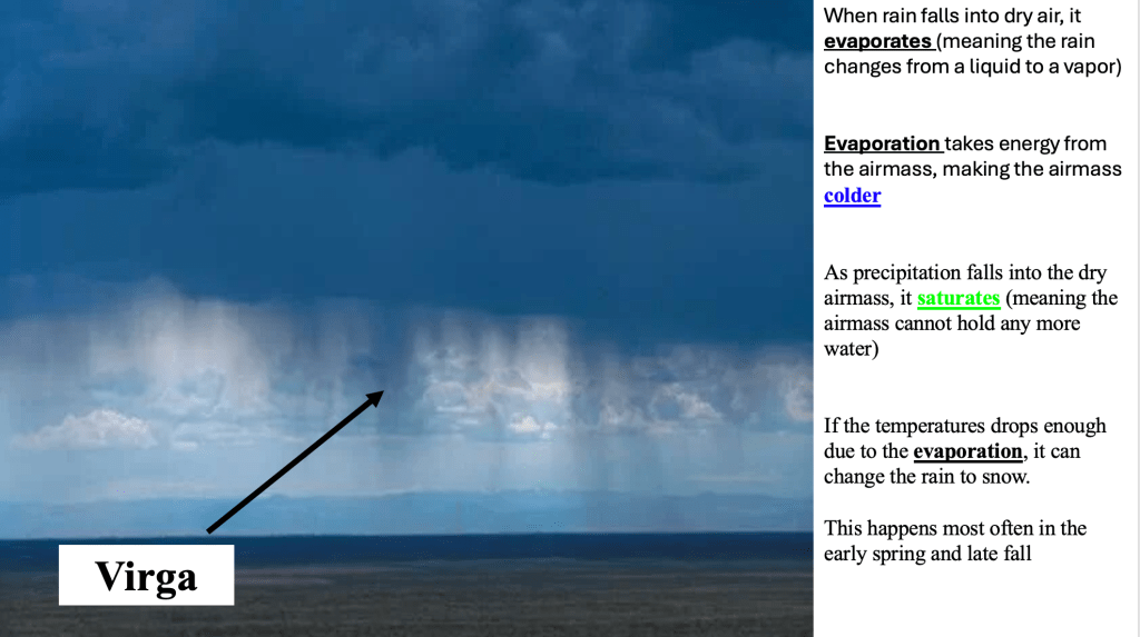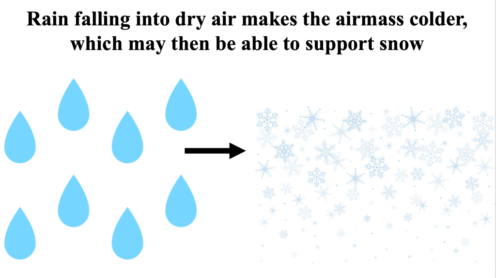 Typically, this process occurs in the early spring and late fall, though it can happen during much of the cool season. If the airmass cools sufficiently as it becomes saturated, the rain can change to snow, especially if the precipitation rate increases. In this scenario, while the precipitation is falling lightly, it tends to fall as rain. However, as the airmass becomes saturated, and the precipitation rates increases, the cooling from evaporation can change the rain to snow, as freezing air descends toward the surface.