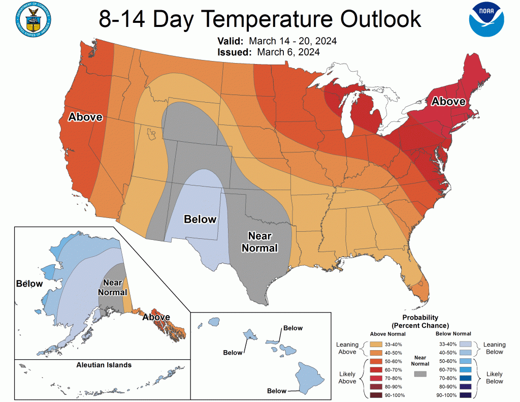 March 2024 has begun decidedly warm and wet, with temperatures averaging five degrees above normal, along with nearly 4.00 inches of rain. Overall the weather pattern looks to remain warm with occasional rainfall through at least the third week of the month, based on the most recent 8-14 day forecast by NOAA’s Climate Prediction Center (CPC). While March 2024 has started warm, even at this pace, it would not result in a record warm March for Toms River. March 2012 was the warmest March of record in this location, some three degrees warmer than the next contestant.