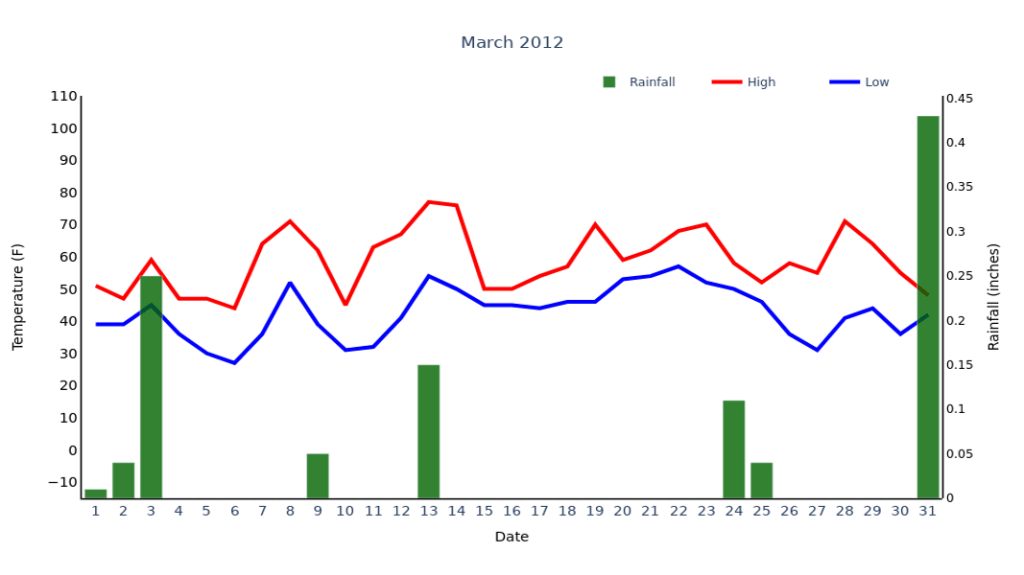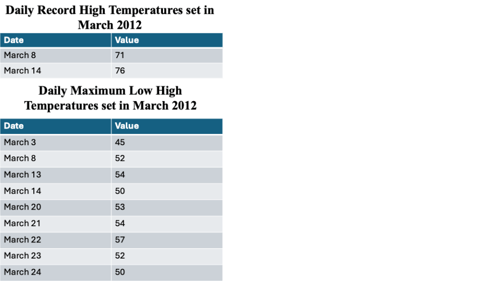 A daily record high temperature was established on March 8th, with another daily record high recorded on the 14th. Despite the record warmth for the month overall, these were the only two record high temperatures during March 2012. During this month, the warmth did not manifest itself through record highs, but rather through record high minimum temperatures.