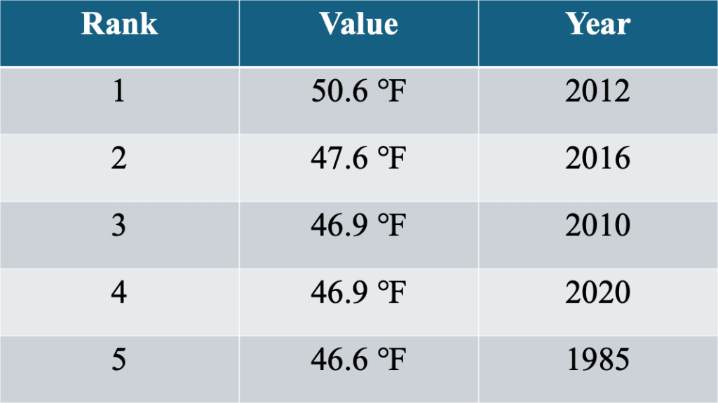 Record high minimum temperatures (often referred to by meteorologists as “mini-maxes”) are the warmest low temperature for any particular date. For example, the low temperature on March 3, 2012 was 45 degrees, meaning that that was the highest temperature value ever recorded as a low temperature for that date. We have seen in recent years that warming has been more profound at night, when the airmass does not have a chance to “reset” before the warmth begins again the next day.