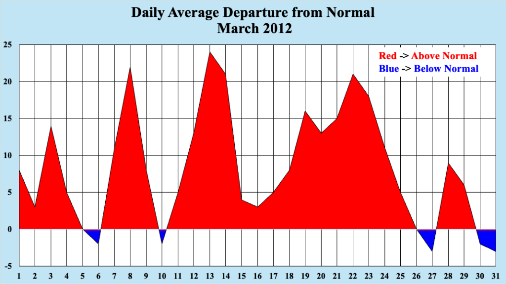 All told, there were nine “mini-maxes” established during March 2012, including five straight days between March 20 and March 24, inclusive. Many of the low temperatures during that stretch were warmer than the normal highs for late March, a testament to the pervasive warmth of the period.
