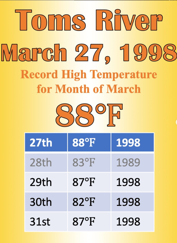 During the last five days of that month (between March 27 and March 31, inclusive), high temperatures equaled over exceeded 80 degrees. The hottest day of the string was March 27th, when the mercury topped out at 88 degrees! That value also qualifies as the warmest temperature ever in March in Toms River, NJ (since 1978).