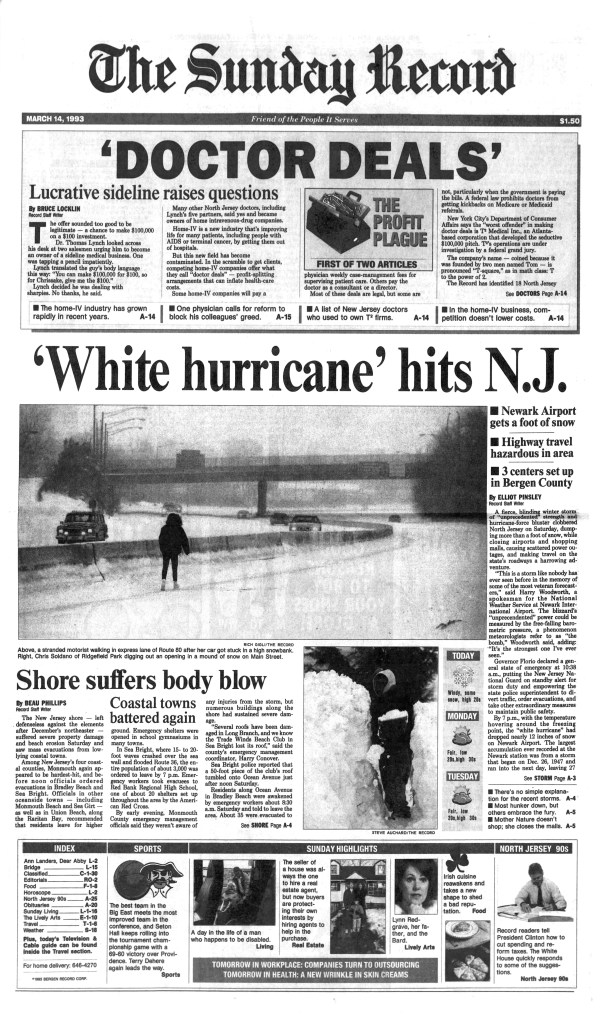 Snow overspread the Jersey Shore during the morning hours of Saturday, March 13, 1993. Even with an easterly wind pushing milder ocean air inland, the precipitation remained mainly snow, a testament to the dry air in place when the snow started. However, the warmer ocean temperatures eventually changed the snow to rain from south to north. By late afternoon, heavy rain was falling from Seaside Heights south along the coast, buffeted by 70 MPH winds, as well as considerable coastal flooding.