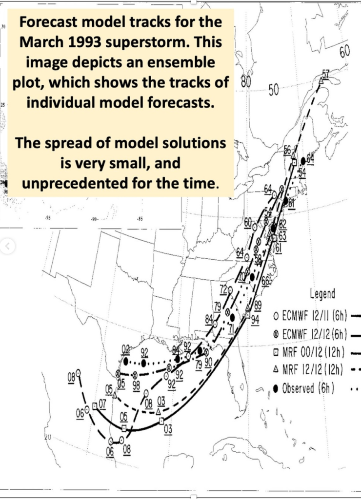 Five days before the storm reached peak intensity near the East Coast, there was a remarkably strong signal in the model data that a significant storm would affect the region. Working for the National Weather Service in Atlantic City, NJ at the time, I was unaccustomed to models agreeing on much with respect to storms until the event was much closer in time and space. Plotting the most recent US and European solutions together on the same map underlined just how strongly the signal was for a powerful storm at the time. Still in a period when models were not as reliable as they are now, it was often difficult to know when to trust them during potentially impactful weather events. For this storm, the signal was clear, allowing forecasters to provide nearly unprecedented lead time and confidence it what would be a catastrophic event for portions of the Eastern US.