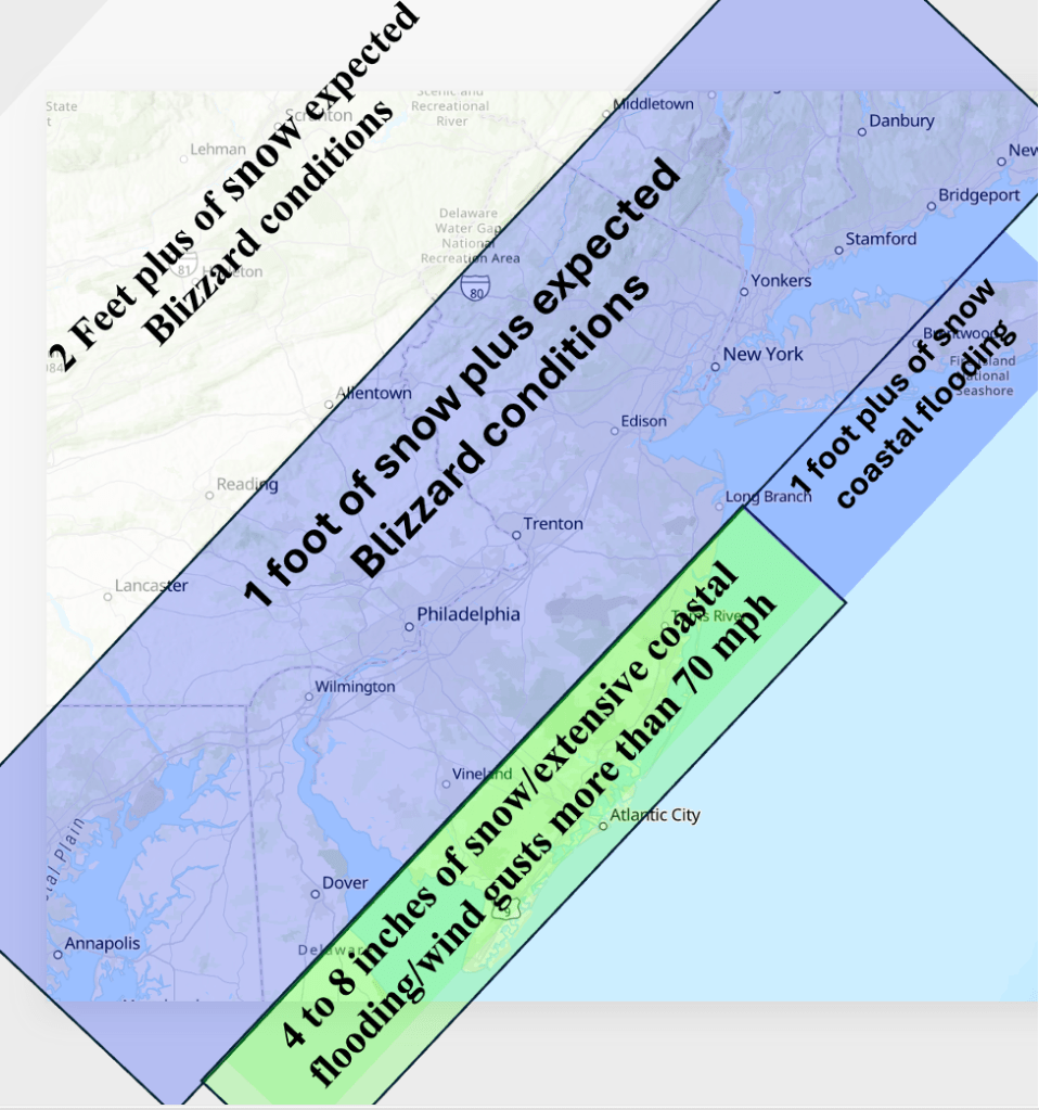 Elsewhere, with cold air locked in place by high pressure across northern New England, there was little doubt that the precipitation would fall in the form of snow. Given model output for precipitation amounts for much of interior NJ and southeast PA, snowfall forecasts of a foot plus were common. Strong winds were expected to gust to near hurricane force near the coast, resulting in considerable blowing and drifting of snow during the heart of the storm Saturday evening into Sunday morning.