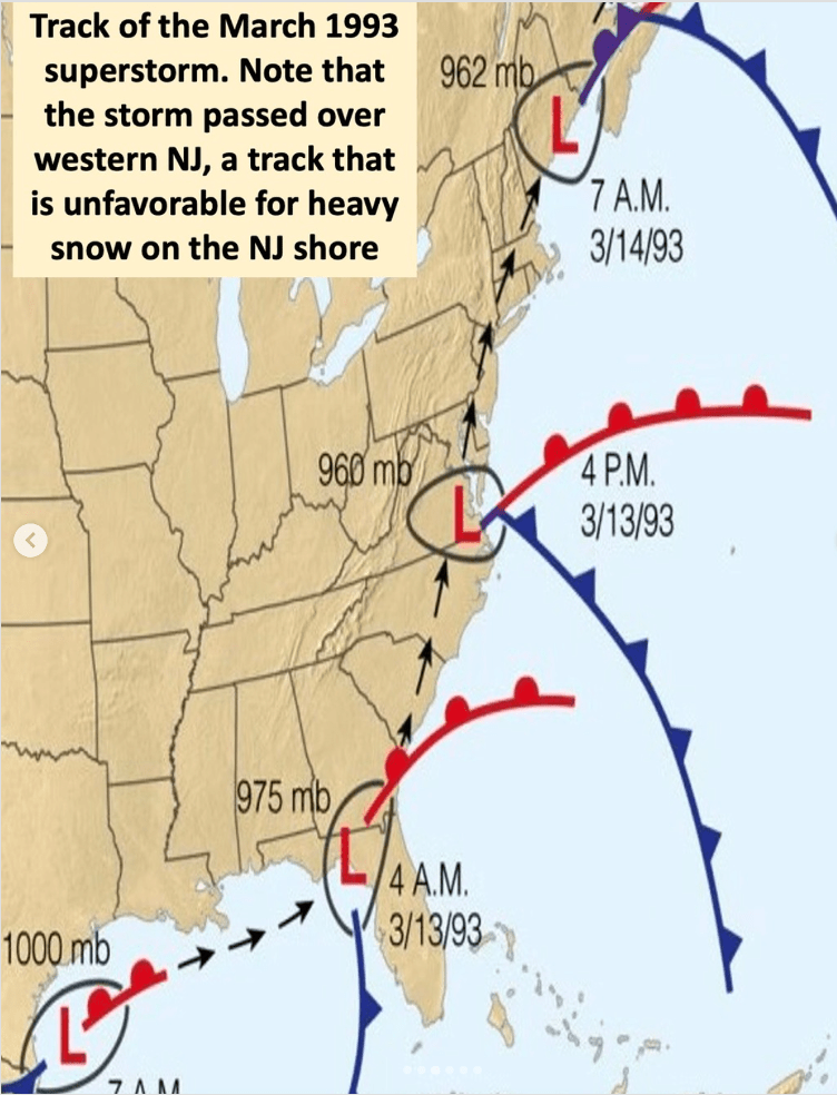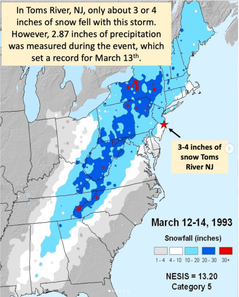 During the period March 11-13 1993, inclusive, a storm tracking from the eastern Gulf Coast into New England produced a swath of devastation that had rarely been seen in these areas. From destructive storm surges across FL and tornadoes across the Southeast to records snowfall across portion of the southern and eastern US, the storm earned the nickname “Storm of the Century”. While its impacts were not quite as dramatic along the Jersey Shore as other places in the eastern US, the storm was a reminder that winter was not down with NJ quite yet.