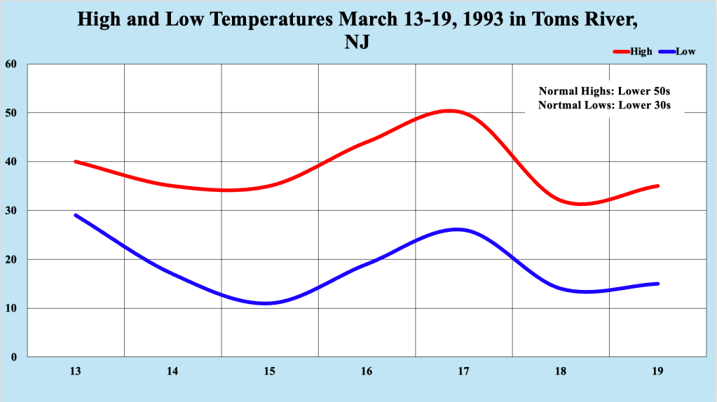 Behind the storm, arctic air covered the mid Atlantic and Northeast states. The cold air ensured that snow, ice and rainwater left behind from the storm froze in place, resulting in treacherous travel on secondary roads along the Jersey Shore through much of the week following the storm. Temperatures averaged 15 to 25 degrees below normal for the Bellcrest section of Toms River, NJ, and four daily record low temperatures established during the cold snap. On March 18th, 1993, the high temperature struggled to reach the freezing mark, and the 32 degree high temperature that day is still the latest a high of 32 degrees or lower was measured at this station.