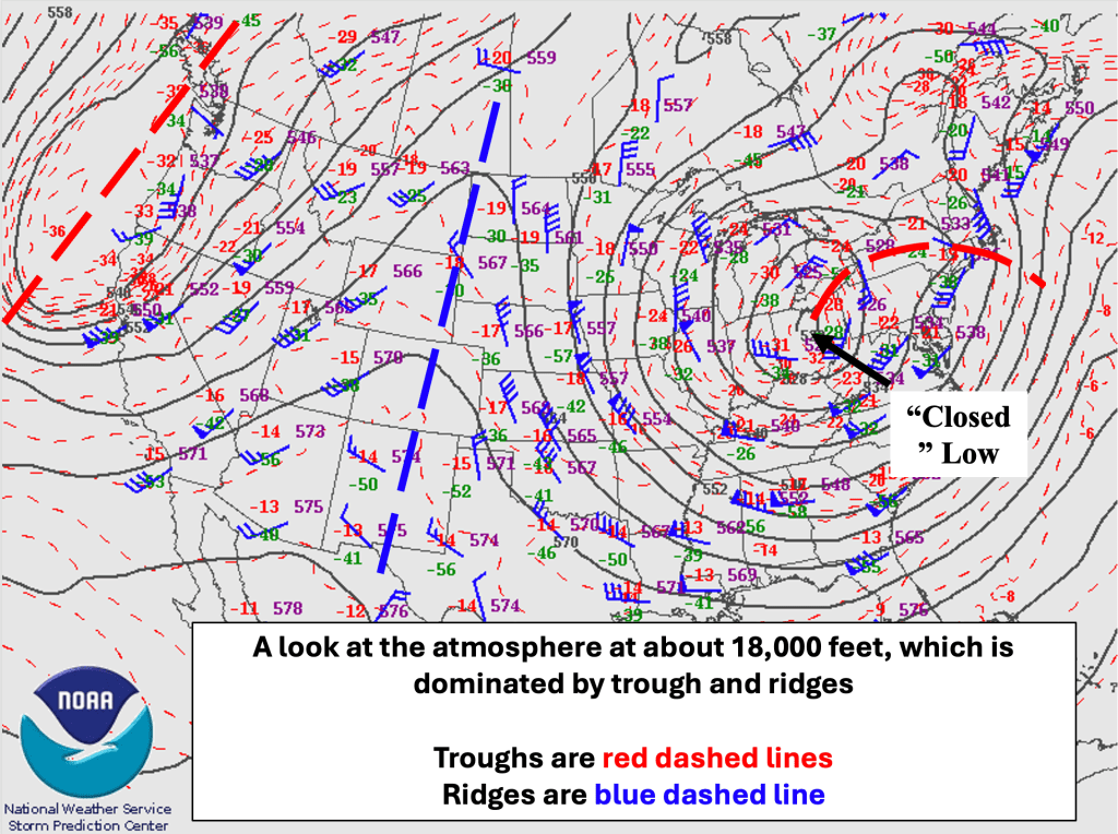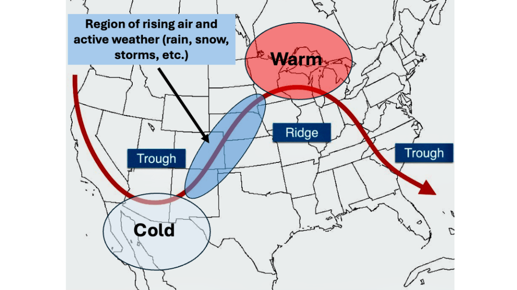 Figure 2 shows what the atmosphere typically looks like at about 18,000 feet above sea level. In this image, we see troughs and ridges, as well as the conditions that are normally expected with them. New to troughs and ridges, or need some more background? Check this out.