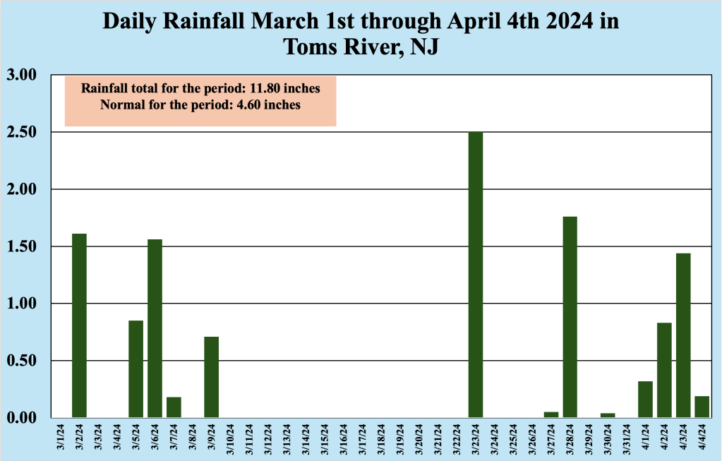 The second half of March into the first few days of April have been more winterlike than springlike, with heavy rainfall and below normal temperatures. Since March 1st 2024, the Bellcrest section of Toms River has received nearly a foot of rain (11.80 inches), with the heavy rain continuing into the first four days of April. However, the overall weather pattern should evolve to look less like winter and more like spring during the next week or so.