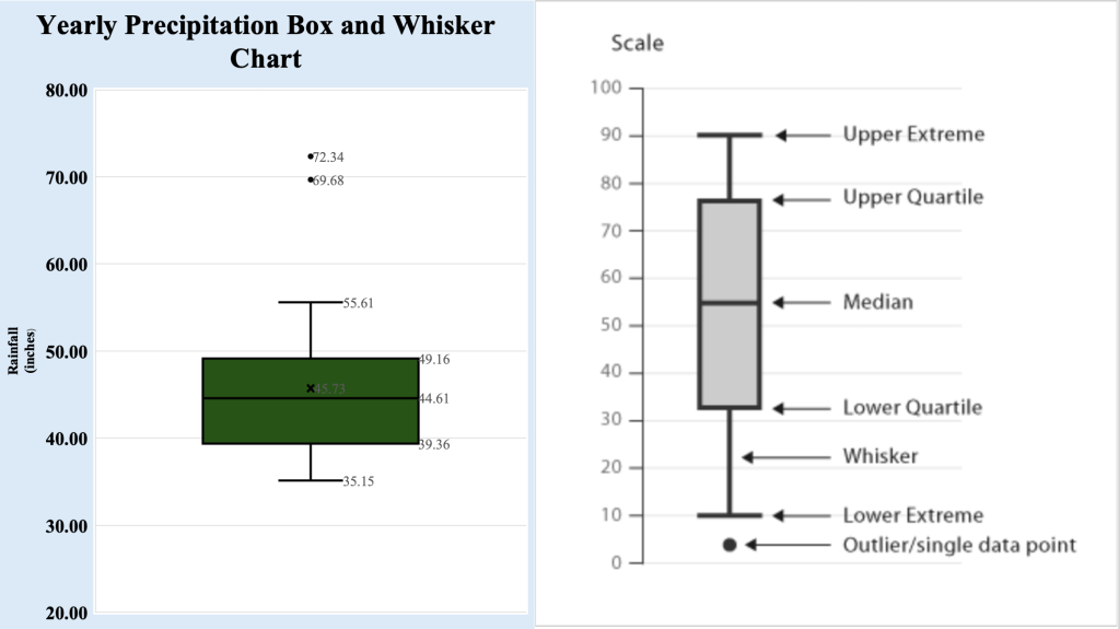 Climatologists and meteorologists, when attempting to describe differences from what is expected often employ a tool know as a box and whisker chart. This chart depicts some of the more often used statistical information used to describe numbers and displays them on a chart. Figure 3 shows a box and whisker chart comprised of the yearly rainfall data from Toms River, NJ. The green box (the box part of the box and whisker chart) in the middle of the chart shows the median value of yearly rainfall (which is like the average rainfall), as well as the higher and lower amounts normally expected. These values are close to what would normally be expected from yearly rainfall here.