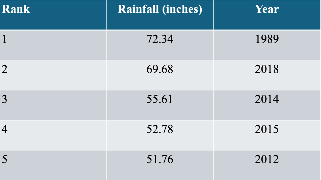 To review, viewing monthly rainfall totals is more familiar for most weather users, as it is the default look for most media outlets. Viewing monthly rainfall amounts allows us to identify more nuanced differences from month to month, something not easily discernible with yearly rainfall data. Even monthly data does not fully describe the variability at this level, as some of the box and whisker charters demonstrate. However, it does allow us a better look at how common weather patterns affect monthly rainfall.