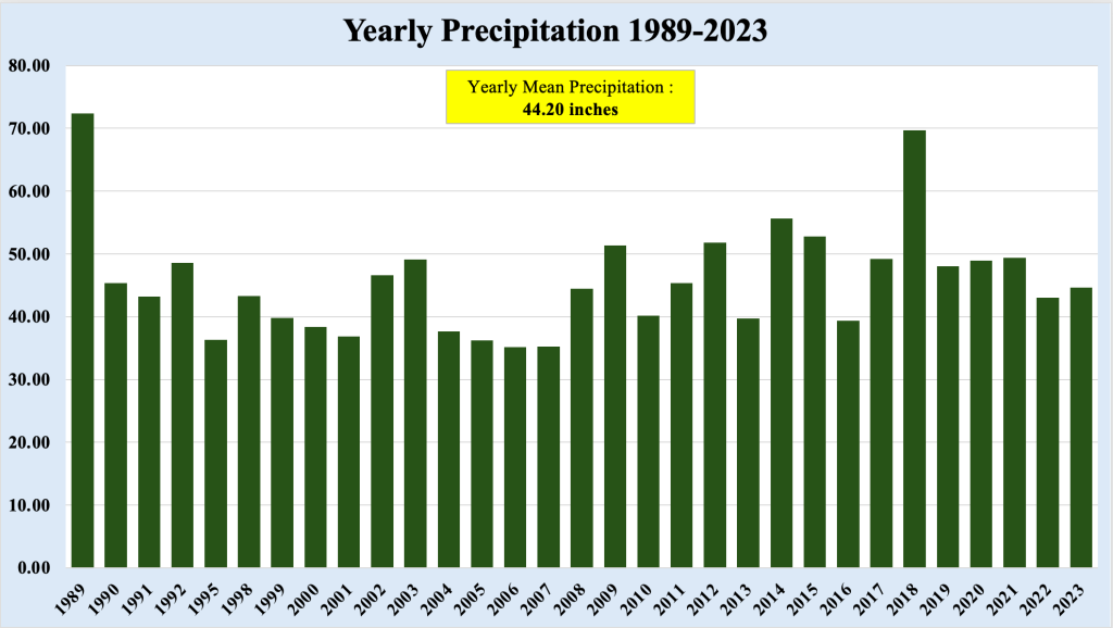 Figure 1 shows a plot of yearly rainfall for the Bellcrest section of Toms River, NJ for the period 1989-2023. Due to missing data in portions of 1993, 1996 and 1997, these years were dropped from the analysis, as the available data would have produced erroneous values of yearly rainfall. Perhaps the most interesting information from this plot is that the yearly rainfall averages 44.20 inches. For the most part, rainfall is distributed fairly evenly, with higher amounts in the warmer months and lesser amounts in the cooler months. However, because rainfall is a discrete value (rainfall can vary greatly over short periods of distance and time), rainfall is not always as evenly distributed as it may seem.