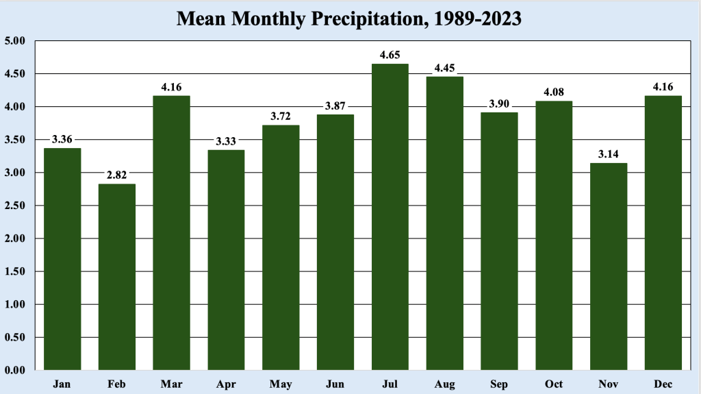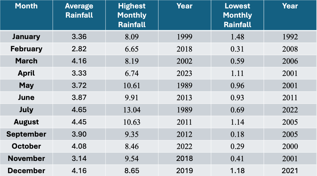 Even with monthly rainfall data, there is a fair amount of variability when it comes to rainfall amounts, regardless of the time of year. For example, while the average rainfall for July is 4.65 inches, the difference between the highest rainfall and lowest rainfall in July is more than a foot! Though not as impressive, May through September have similar differences between the wettest and driest of each month, when compared to the cooler months (generally November through April).