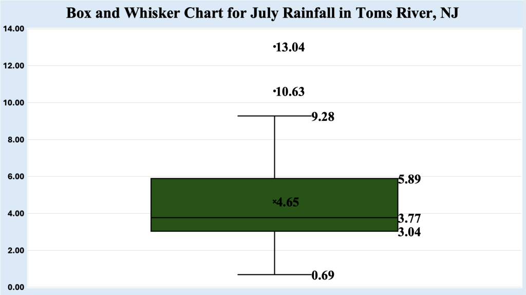 Figure 5 shows another box and whisker chart, this time for July rainfall in the Bellcrest section of Toms River, NJ. Note the 4.65 inch value next to the x inside the box, indicating the mean value of rainfall for July. The values of 5.89 inches and 3.04 inches are the values that can be expected from the 32 years of rainfall data, meaning that at least two of three July will have rainfall amounts between these two values.
