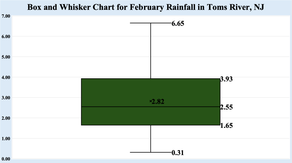 Figure 6 shows another box and whisker chart, this time for February rainfall in the Bellcrest section of Toms River, NJ. Again note the 2.82 inch value next to the x inside the box, indicating the mean value of rainfall for February. The values of 3.93 inches and 1.65 inches are the values that can be expected from the 32 years of rainfall data, meaning that at least two of three Februarys will have rainfall amounts between these two values.