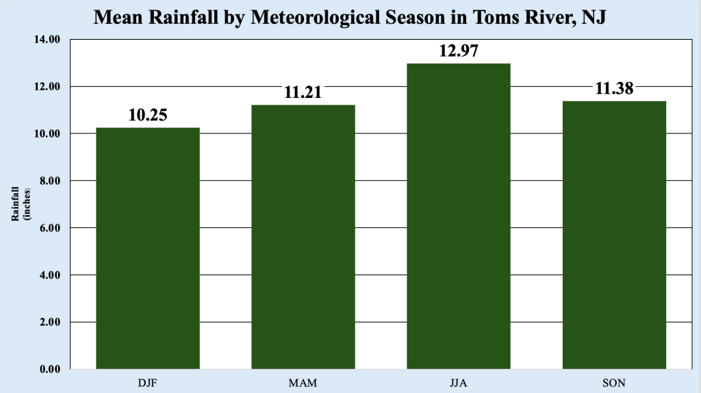 Figure 7 shows the mean values of rainfall for each of the four meteorological months in Toms River, NJ. Note that the season with the lowest mean rainfall is winter, and this is not unexpected, as these months generally have the lowest moisture content in the atmosphere. Rainfall is driven almost exclusively by winter like storms, and thunderstorms are rare during this time. Though rainfall is generally well distributed during winter, amounts can be dependent on the overall winter pattern. This was the case during the winter of 2024, when 15.66 inches of rainfall was recorded in a very wet patten, which was 33 percent higher than average.