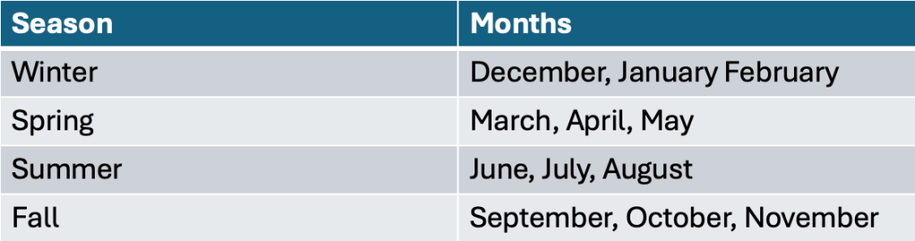 From a meteorological standpoint, it might make the most sense to study rainfall by season, rather than yearly or monthly. Looking at seasonal rainfall allows us to better identify patterns that result in rainfall amounts, instead of attempting to frame them by temporal definitions that are not as conducive to identifying these patterns. In order to make the math easier, the four meteorological seasons are assigned as follows: