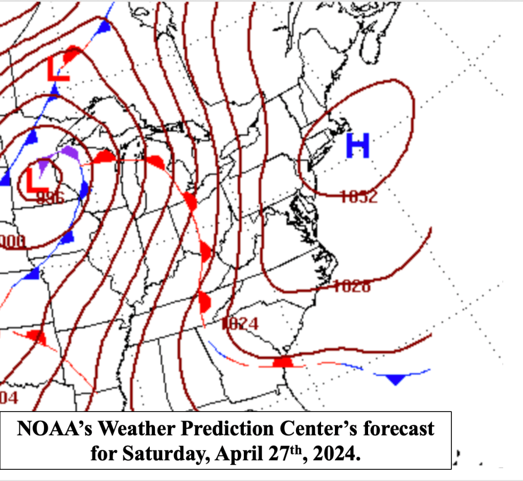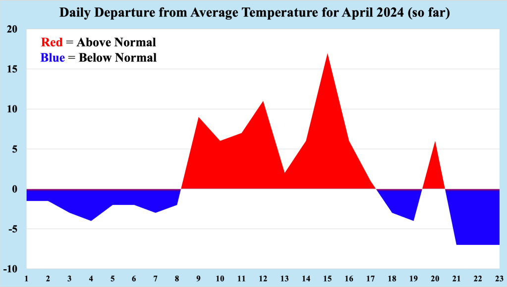 Despite the temperature swings so far during April 2024 in the Bellcrest section of Toms River, NJ, the month on the whole thus far has featured near normal temperatures and near normal rainfall. Below normal temperatures for the first week of the month were replaced by about 10 days of above normal temperatures (during which time Toms River hit 80 F for the first time this year, on 15th). After the passage of a cold front on the 17th, temperatures have averaged below normal. During this cool snap, we recorded our lowest temperatures of the month (35 F on both the 22nd and 23rd). Generally record low temperatures during mid to late April are in the mid 20s to lower 30s, so despite low temperatures flirting with the freezing mark, no daily record low temperatures were set during this time.