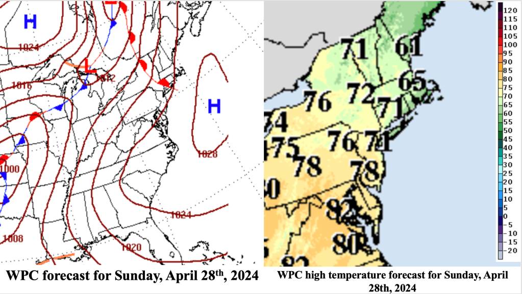 Low pressure crossing Ontario into Quebec drags a warm front across the Northeast during Sunday. This pushes the high pressure system off the coast to southward, allowing surface winds to shift to the southwest, beginning a warming process that lasts into early next week. High temperatures Sunday should be about 10 degrees warmer than Saturday, meaning that highs should reach into the 70s across most portions of NJ. The exception here could be the Jersey Shore, especially if surface winds remain more south than southwest. That small deviation in wind direction could mean that the Bellcrest section of Toms River NJ could top out just short of the 70 degree mark, despite the sunshine.