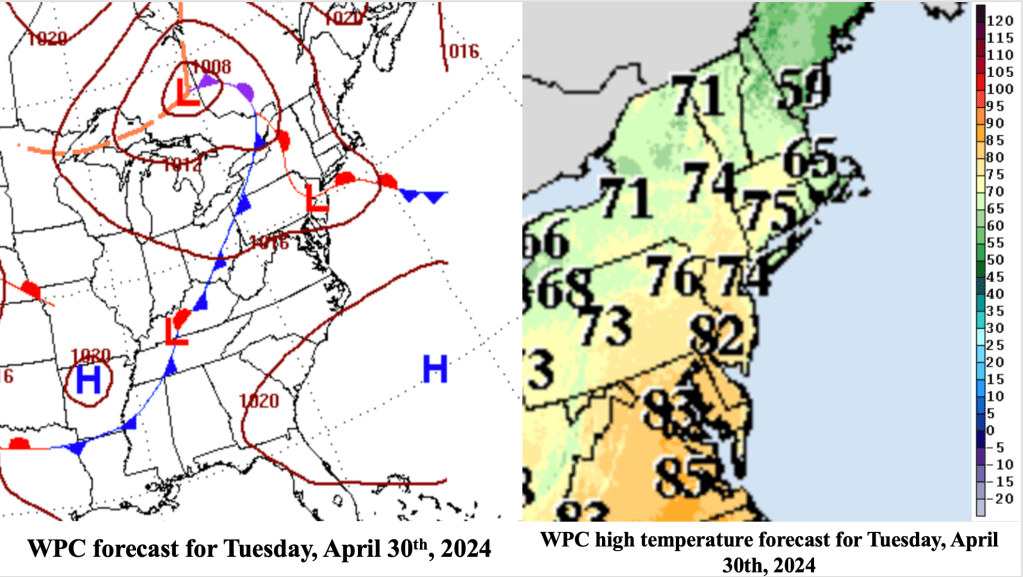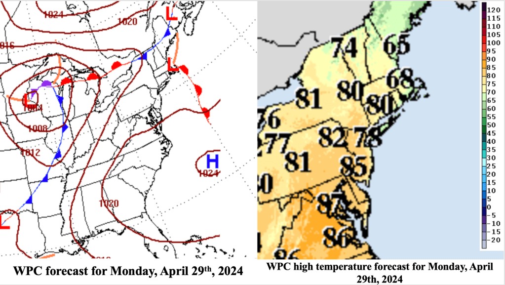 As the surface high drifts further south, it reaches a position off the NC coast, and it begins to resemble the Bermuda High that provides hotter and more humid conditions along the Jersey Shore during the summer months. This airmass is not nearly that warm, but all areas should see southwest winds, which might keep the sea breeze at bay along the Jersey Shore during Monday. High temperatures there could approach 80 degrees F, even if a sea breeze does indeed develop during the afternoon. Should the Bellcrest section of Toms River, NJ reach the 80 degree mark, it would fall well short of the daily record high temperature for the date, which is 89 degrees, set in 2017.