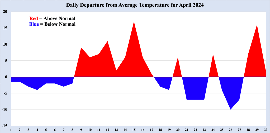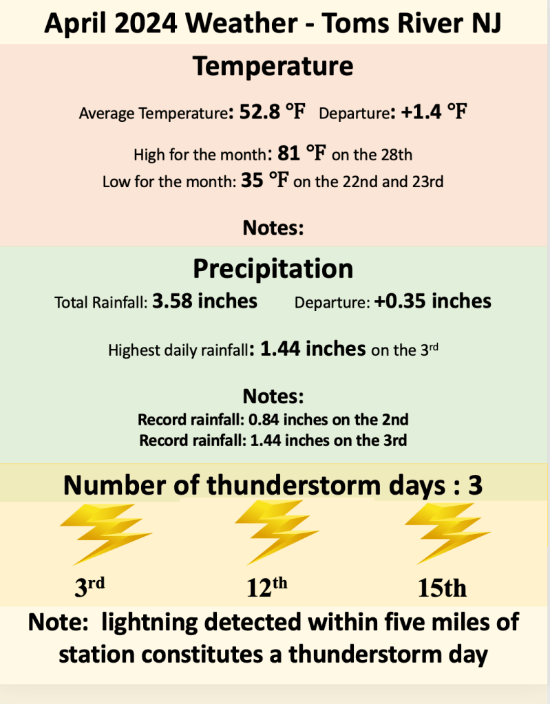 Finally, though April 2024 was “only” about one and one-half degrees above normal, it marked the seventh month with above normal temperatures of the last eight months in Toms River. Only November 2023 experienced below normal temperatures during that streak.