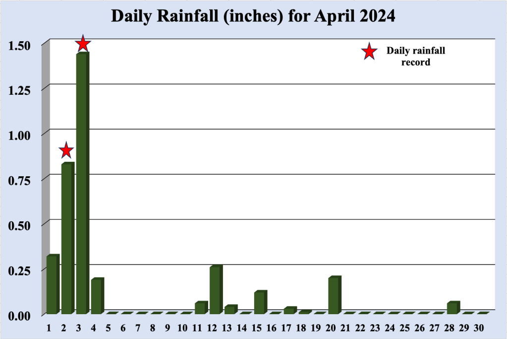 For the last three weeks of April 2024, rainfall was generally light, measuring less than 0.25 inches during each event. For the month, 3.85 inches of rainfall was recorded in the Bellcrest section of Toms River, which is close to the long term average of 3.23 inches. By comparison, the wettest April for this location occurred just last year, when 6.74 inches fell, and the driest April happened in 2001, when a mere 1.11 inches of rain was collected.