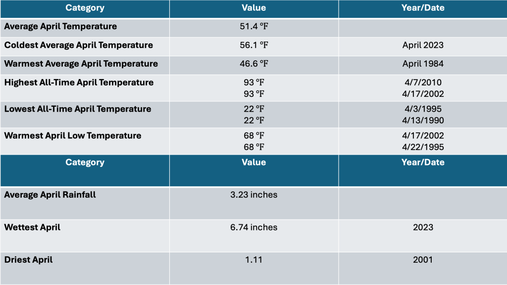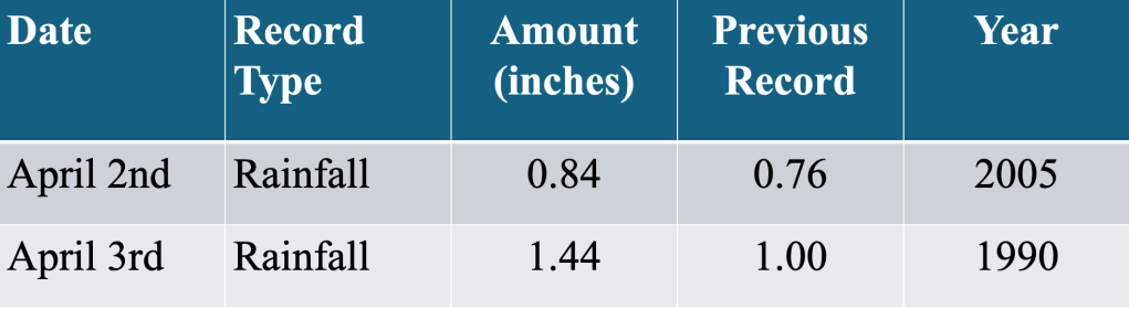 Nearly three quarters (72%) of all of the rainfall recorded during April 2024 occurred in the first four days of the month, with two new daily rainfall records established. After appearing as though the pattern would support yet another month of heavy rainfall, warmer temperatures pushed fronts north of the Jersey Shore, keeping much of the rainfall to the north as well. April is a transition month with respect to rainfall, as the extratropical lows (winter like storm systems) move north of the region with the the jet stream, but rainfall associated with thunderstorms generally do not arrive until later in the month.